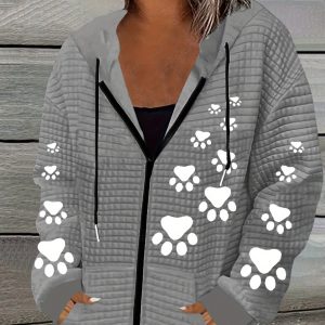 This product has multiple variants. The options may be chosen on the product pageWomen's Coats & JacketsWomen’s Casual Waffle Knit Hooded Jacket with Cute Cat Paw Print, Zipper Closure and Drawstring – Machine Washable Polyester, Geometric Pattern