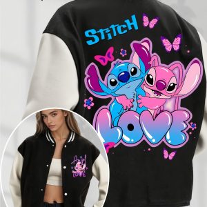 This product has multiple variants. The options may be chosen on the product pageWomen's Coats & JacketsWomen’S Stitch & Angel Love Heart Print Baseball Jacket – Cozy Fleece-Lined Casual Outerwear with Vibrant Cartoon Design, Black & White Striped Collar, Perfect for Fallu002FWinter Parties & Casual Attire, Winter Jacket | Playful Design | Durable Fabric