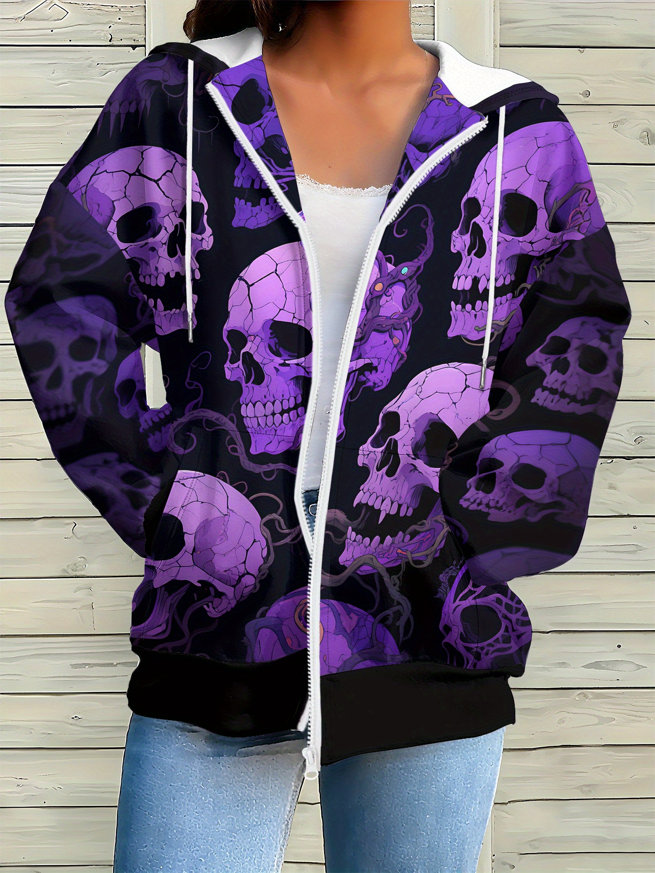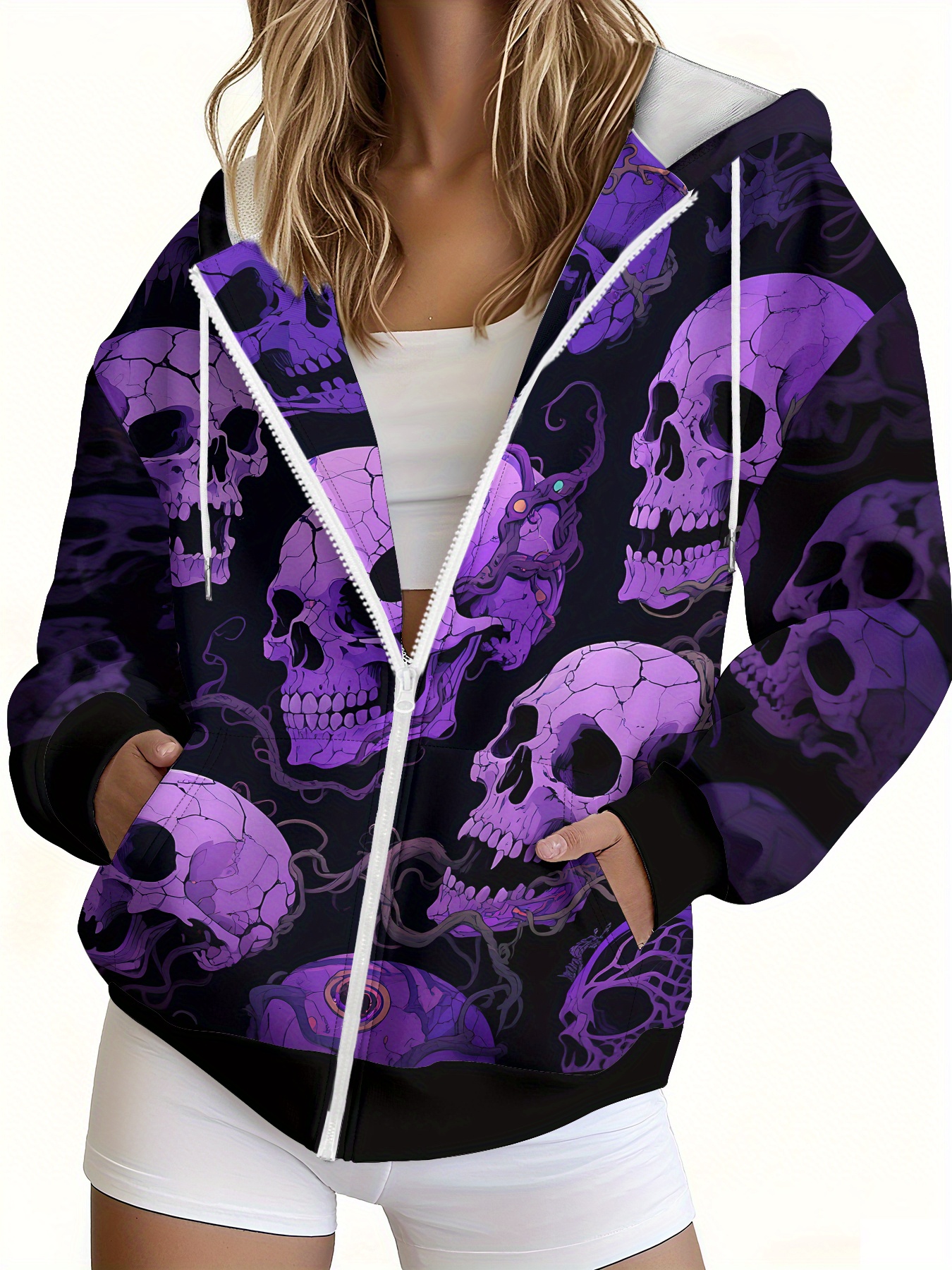 - 2025 New Women’s Gothic Streetwear Zip-Up Hooded Jacket with Skull Print, All-Season Machine Washable Unisex Coat, Durable Zipper Closure & Full-Body Graphic Design