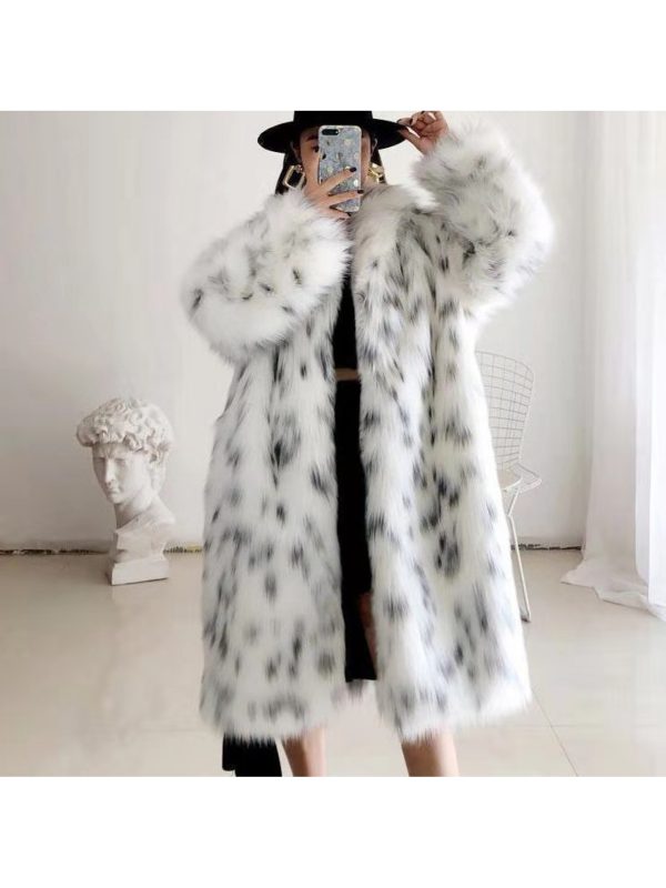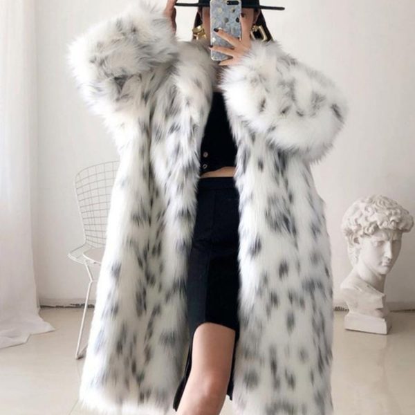 - Black And White Leopard Print Women’s Faux Fur Coat with Fashionable Long Collar Fox Fur Jacket