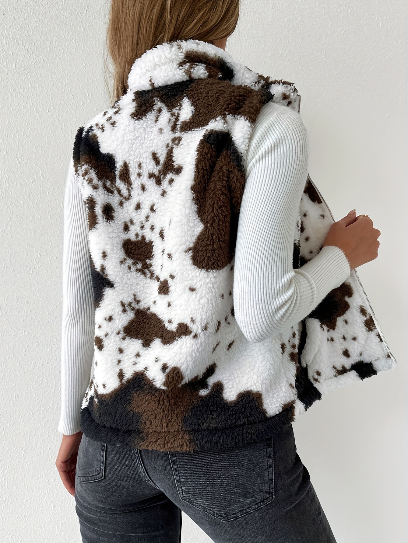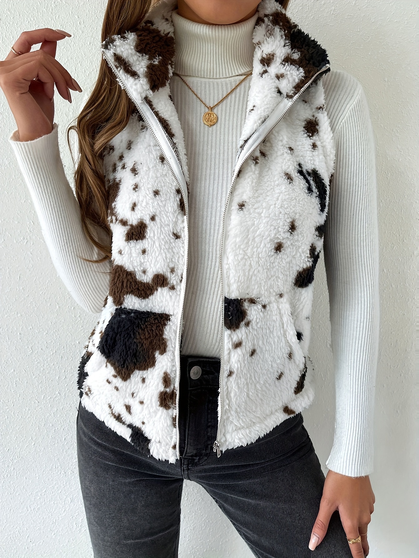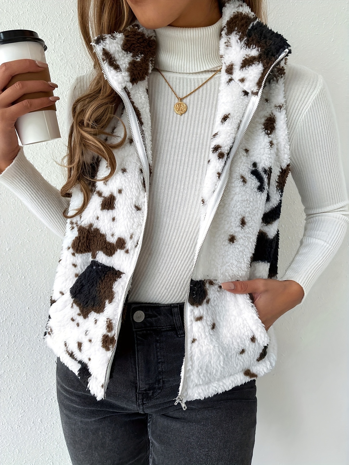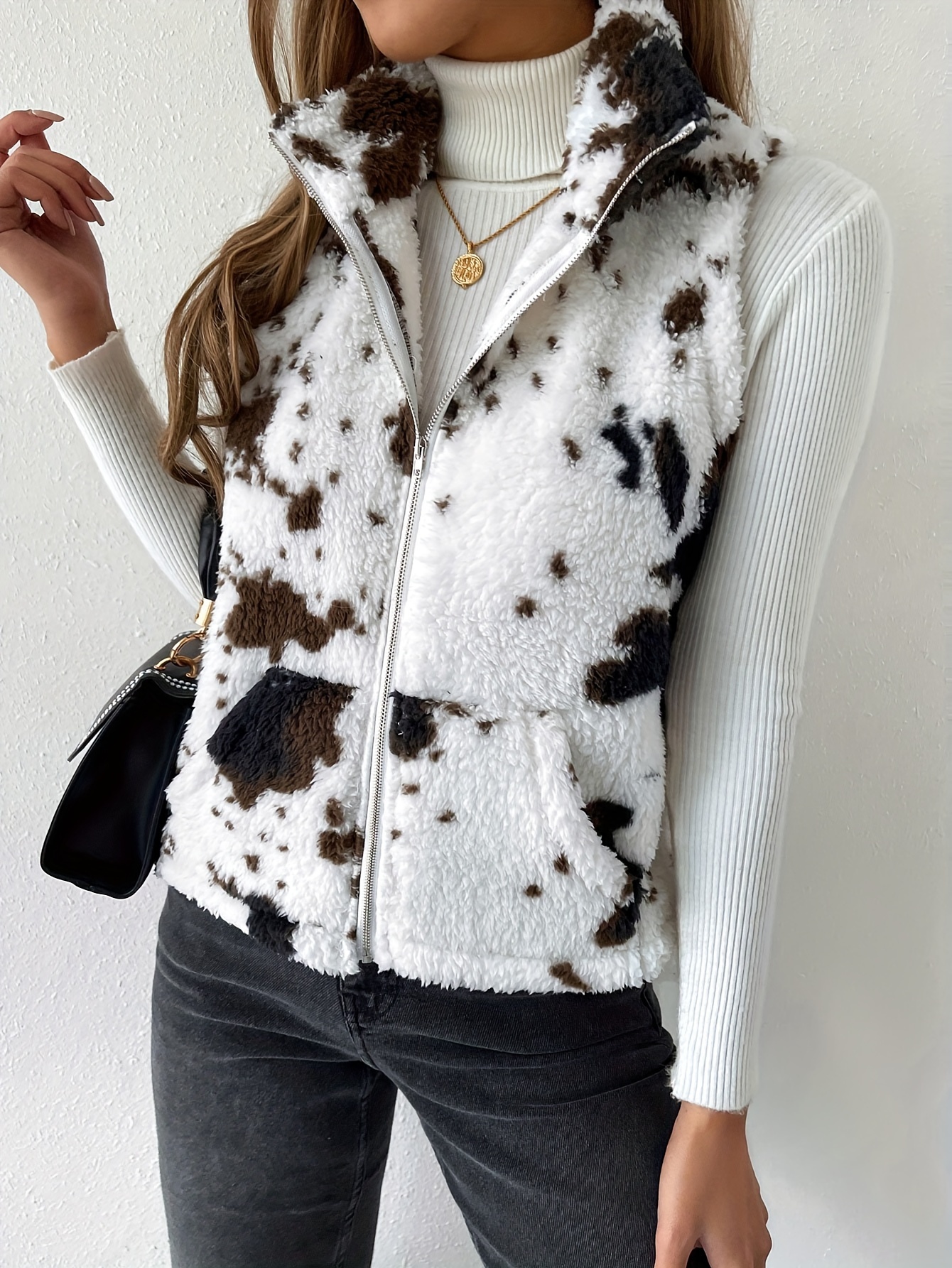 Elegant Special Spot Print Teddy Bear Vest Jacket, Zipper Plush Cardigan Gilet