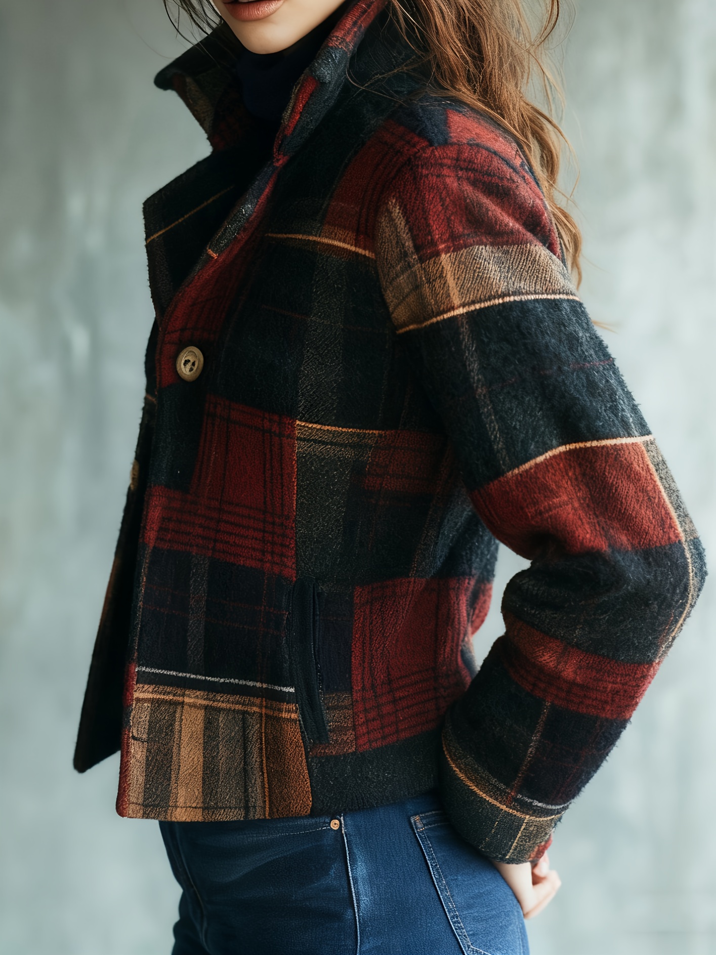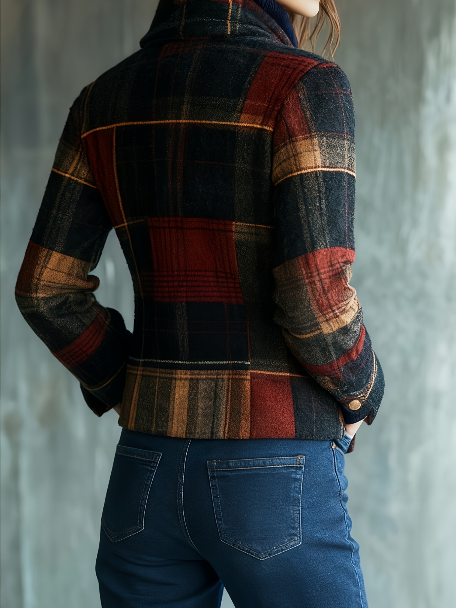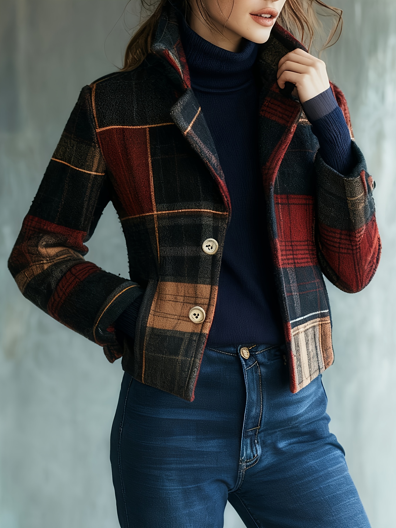 - Fashionable Women’S Autumn And Winter Plaid Elegant Retro Warm Stand Collar Splicing Button Jacket Small Suit Female Jacket