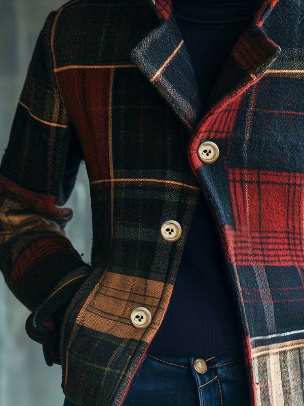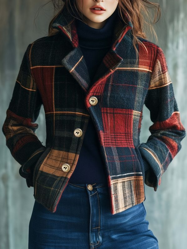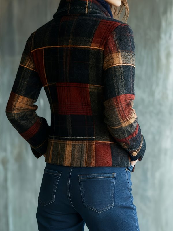 - Fashionable Women’S Autumn And Winter Plaid Elegant Retro Warm Stand Collar Splicing Button Jacket Small Suit Female Jacket