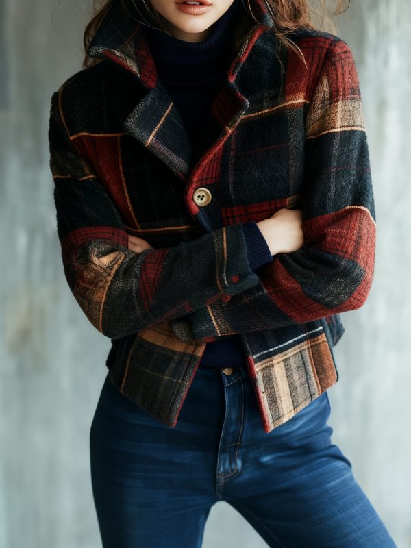 Be the first to review “Fashionable Women’S Autumn And Winter Plaid Elegant Retro Warm Stand Collar Splicing Button Jacket Small Suit Female Jacket” Cancel reply