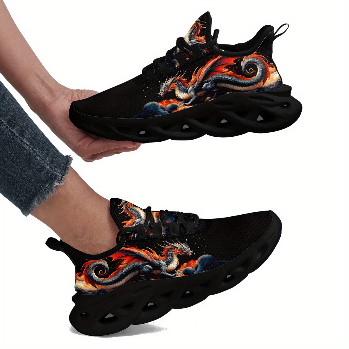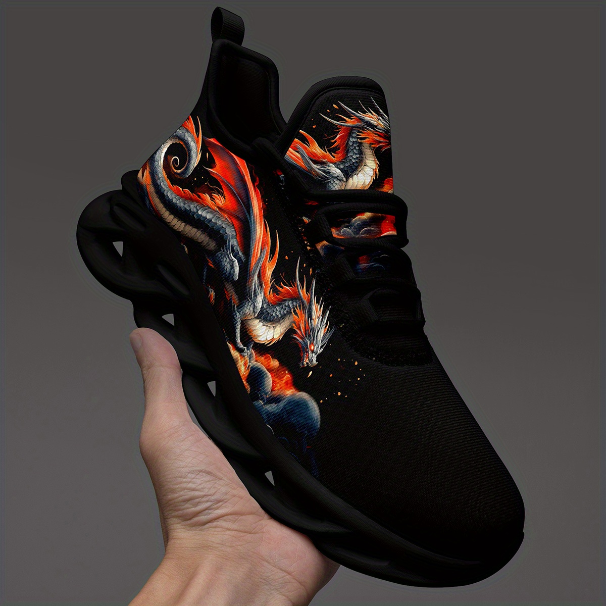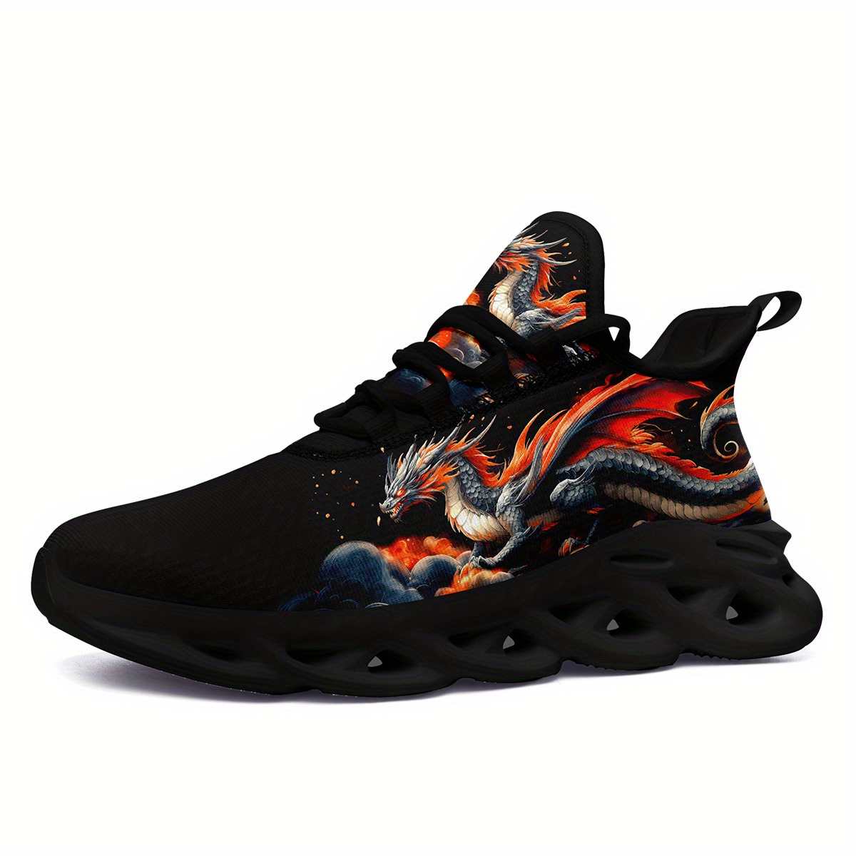 Men’S Gothic Dragon Design Low-Top Sneakers – Black & Orange Streetwear Lace-Up Shoes, Breathable Fabric Upper, Cushioned EVA Sole, Comfortable Walking Trainers for All Seasons, Casual Fashion Footwear, Dragon Sneakers, Allseason Footwear, Dynamic Graphic Design, Fabric Upper Shoes