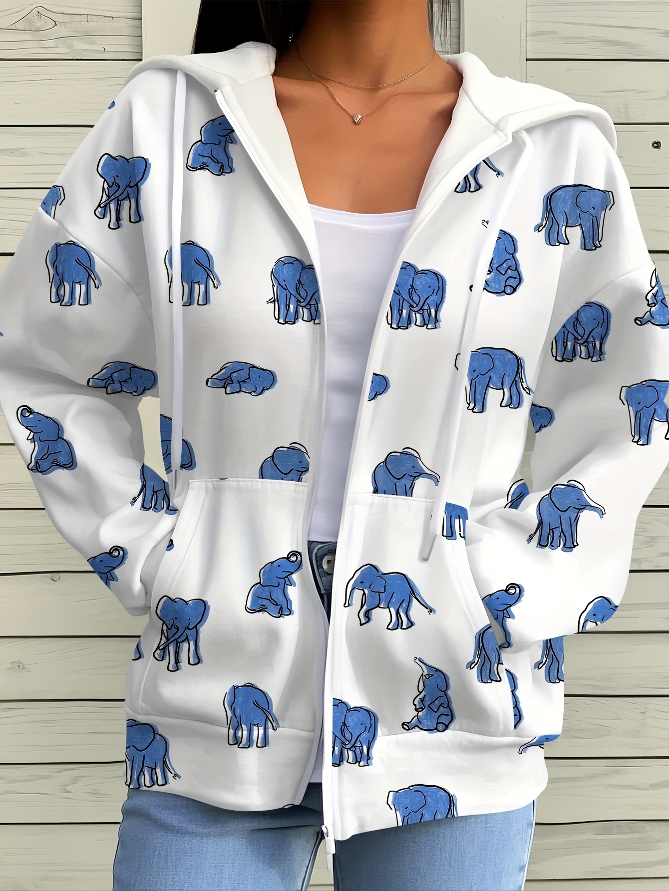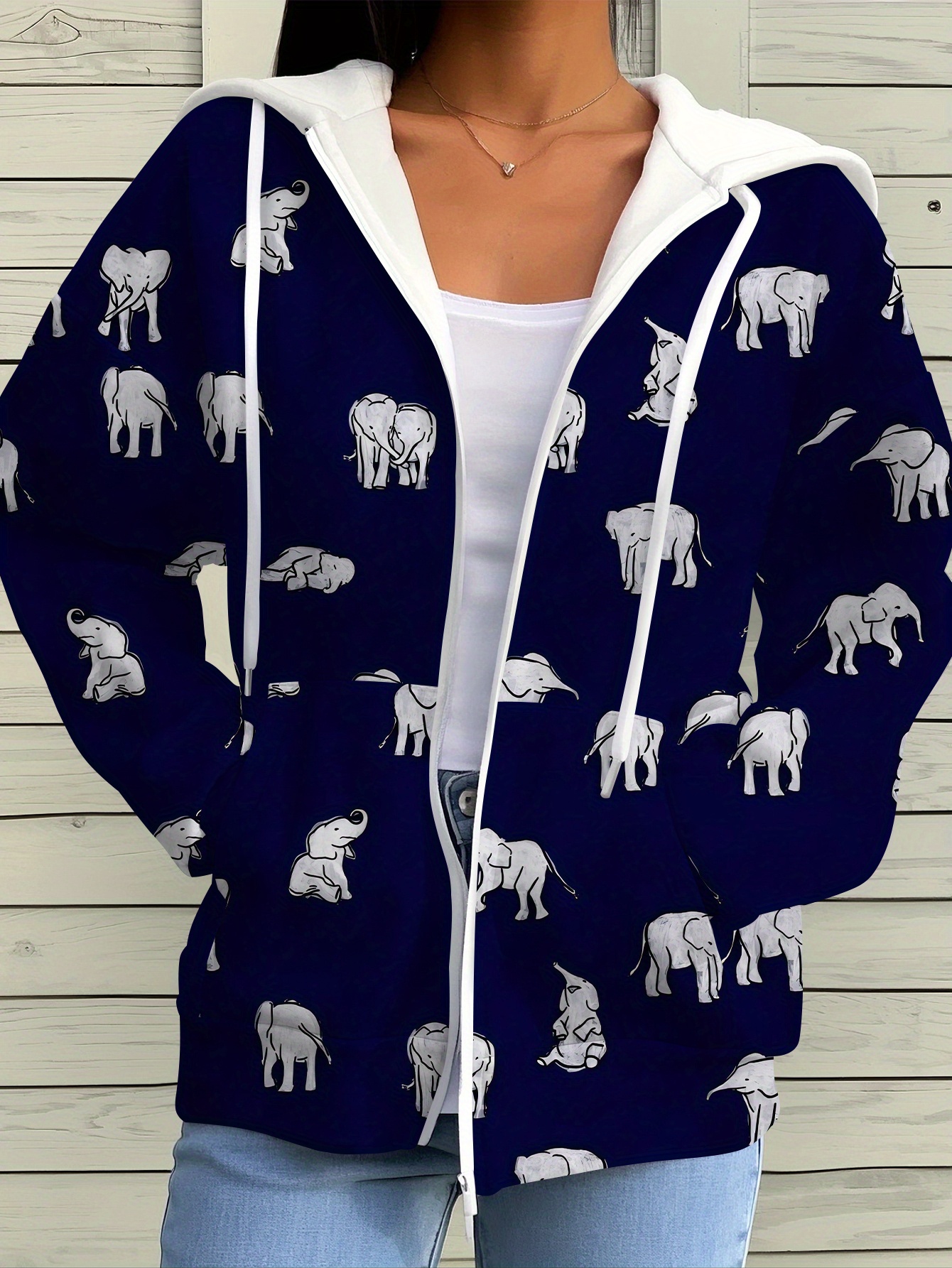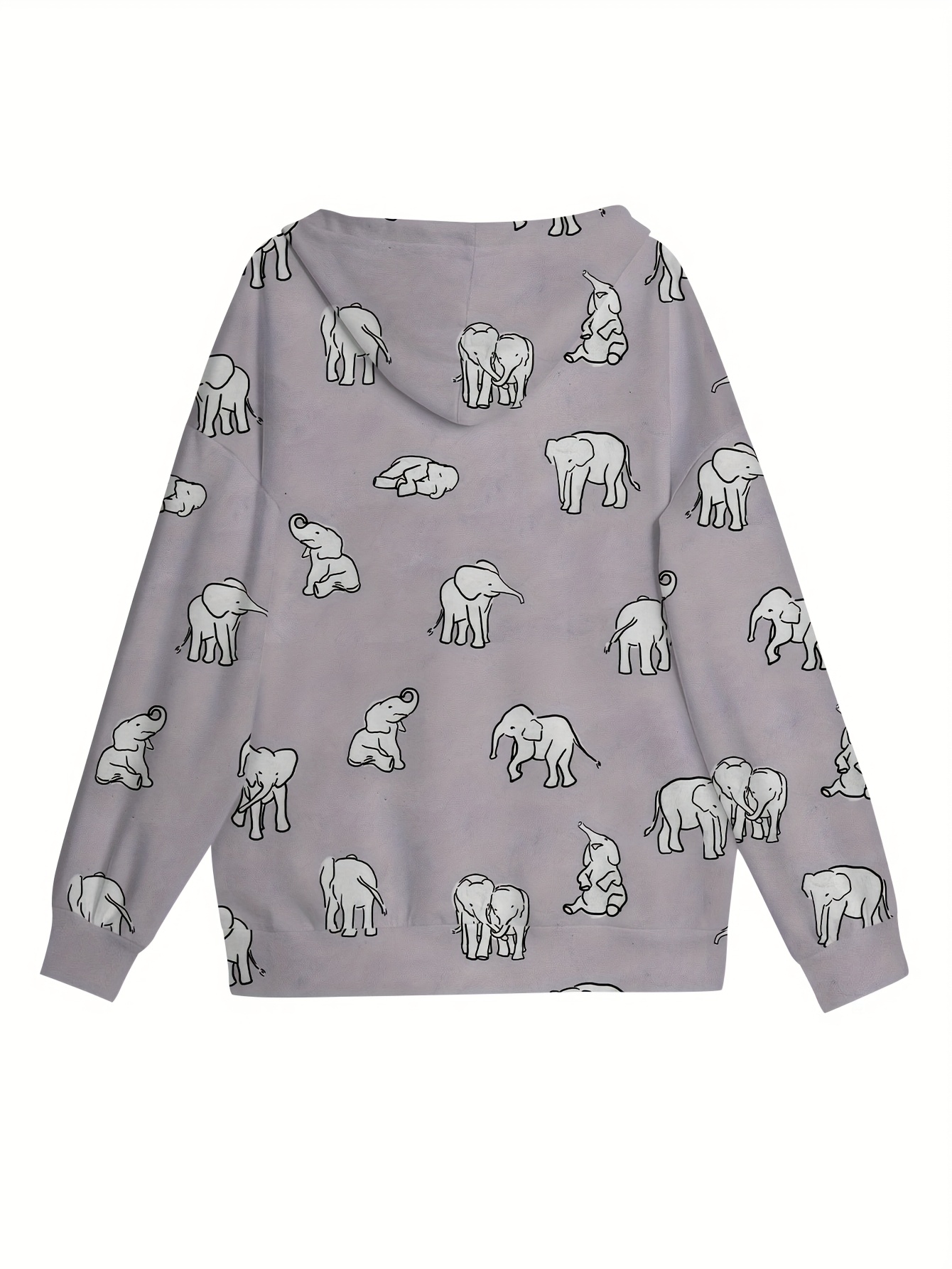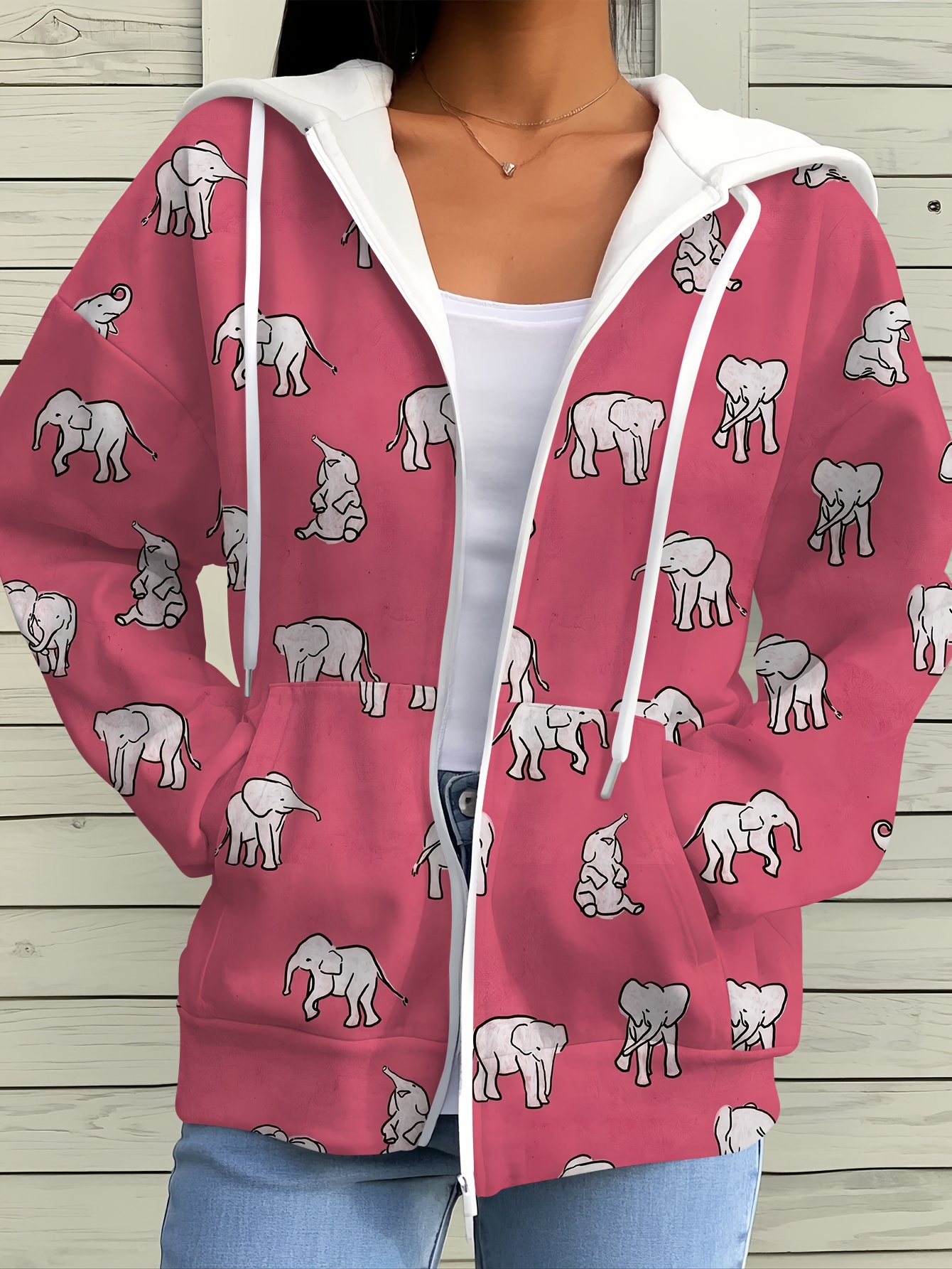 ‘s Pink & Grey Elephant Print Hooded Jacket Coat with White Zipper – Full-Zip Front Closure Winter Warm Casual Outerwear, Cute Pink Elephant Pattern Blazer for Mature Ladies, Machine Washable Fall Winter Coat