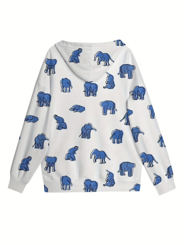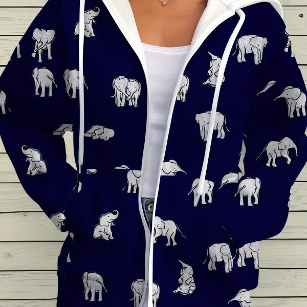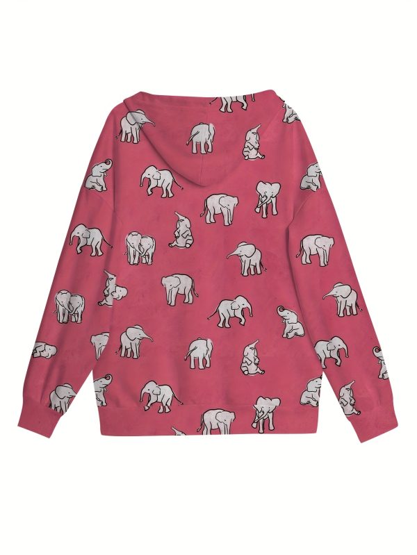 ‘s Pink & Grey Elephant Print Hooded Jacket Coat with White Zipper – Full-Zip Front Closure Winter Warm Casual Outerwear, Cute Pink Elephant Pattern Blazer for Mature Ladies, Machine Washable Fall Winter Coat