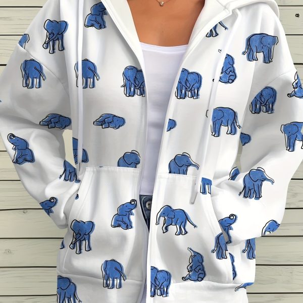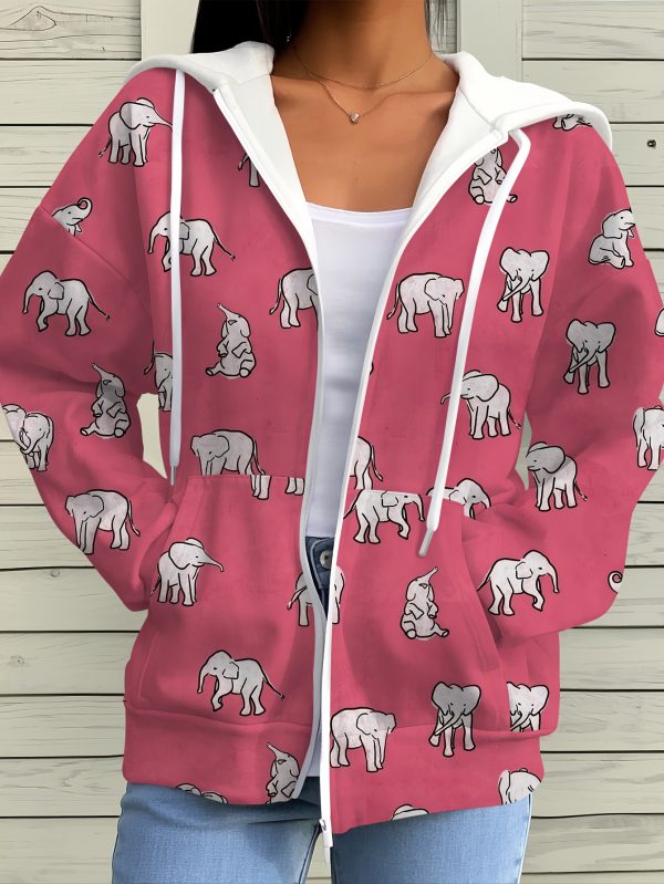 - ‘s Pink & Grey Elephant Print Hooded Jacket Coat with White Zipper – Full-Zip Front Closure Winter Warm Casual Outerwear, Cute Pink Elephant Pattern Blazer for Mature Ladies, Machine Washable Fall Winter Coat