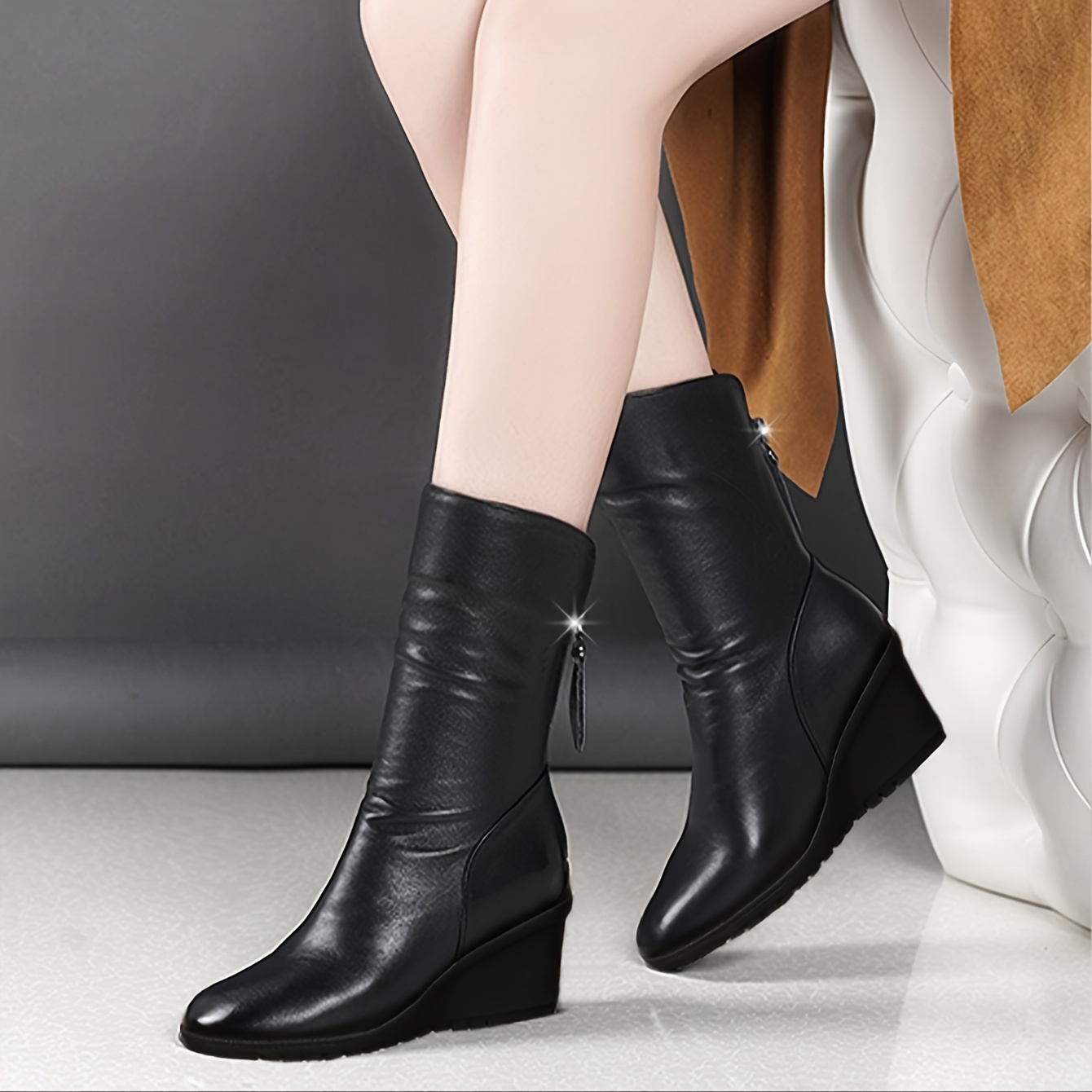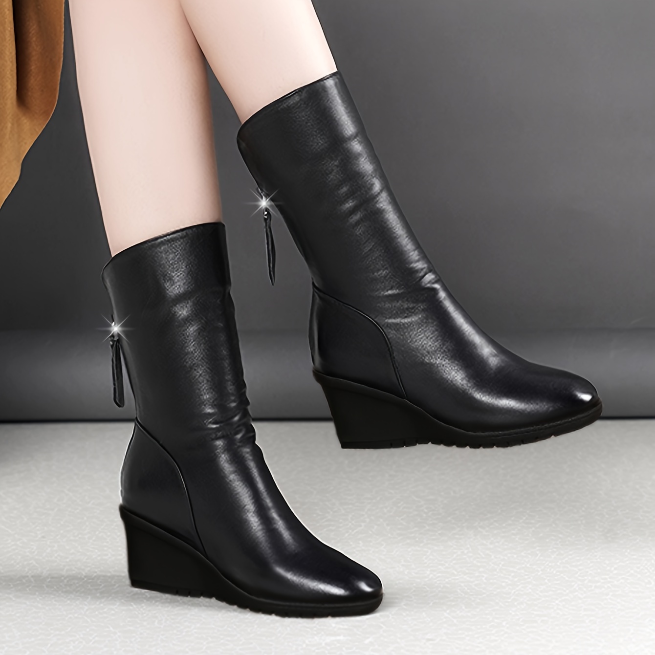 - Women’s Black Mid-Calf Boots with Adjustable Ankle Strap & Back Zipper – Faux Cover Slope Heel, Round Toe Comfortable Winter Boots for Casual & Formal Outfits, Formal Footwear, Sleek Boot Design, Durable Pu Sole, Sturdy Construction, Office Wear
