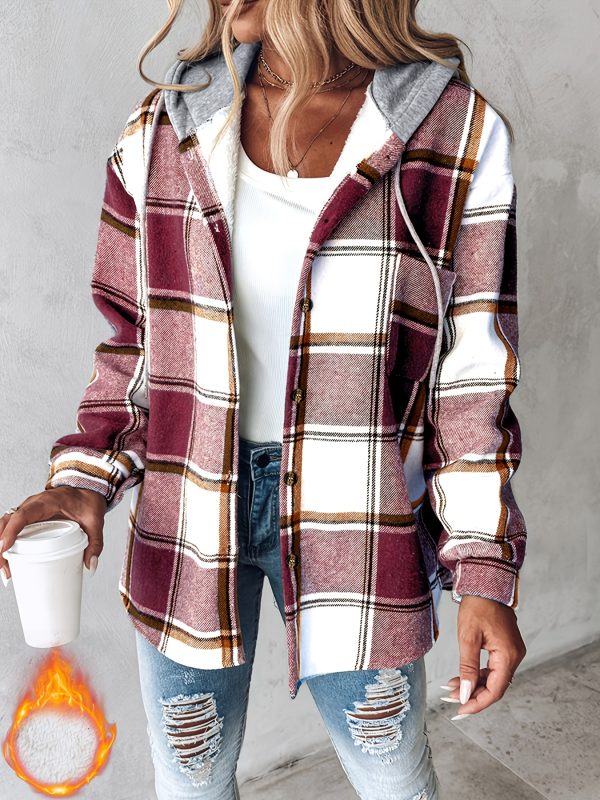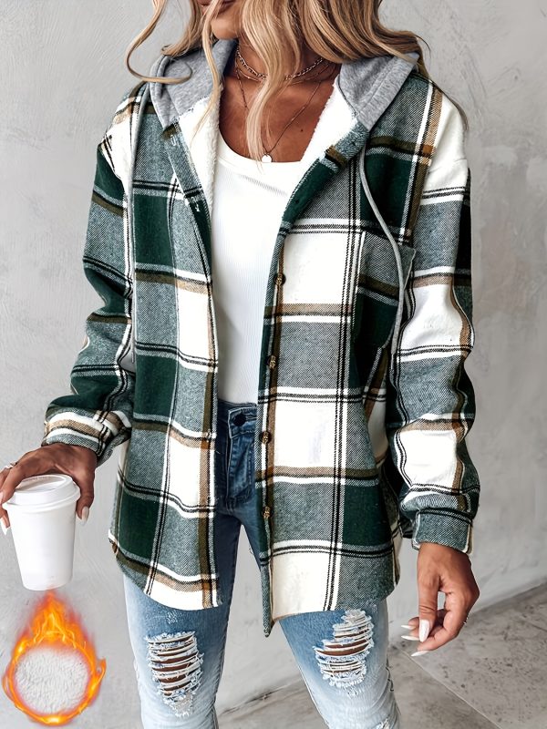 Women’s Plaid Hooded Jacket with Fleece Lining – Cozy Winter Coat, Adjustable Drawstring Hood & Button Front, Casual Warm Outerwear for Fall and Winter, Machine Washable (Brownu002FBeigeu002FWhiteu002FBlack), Seasonal Fashion, Cold Weather Coat, Buttonfront Coat, Durable Fabric, Casual Attire