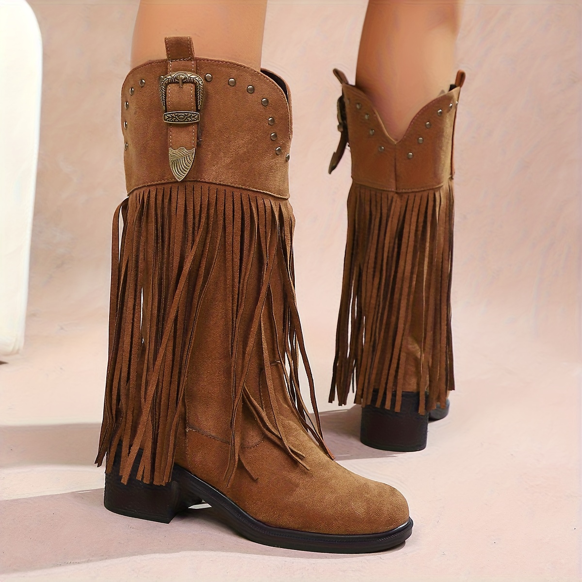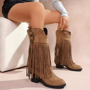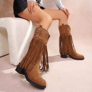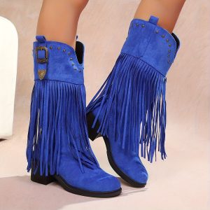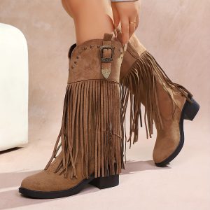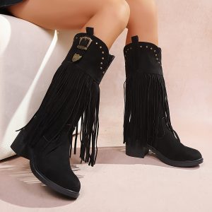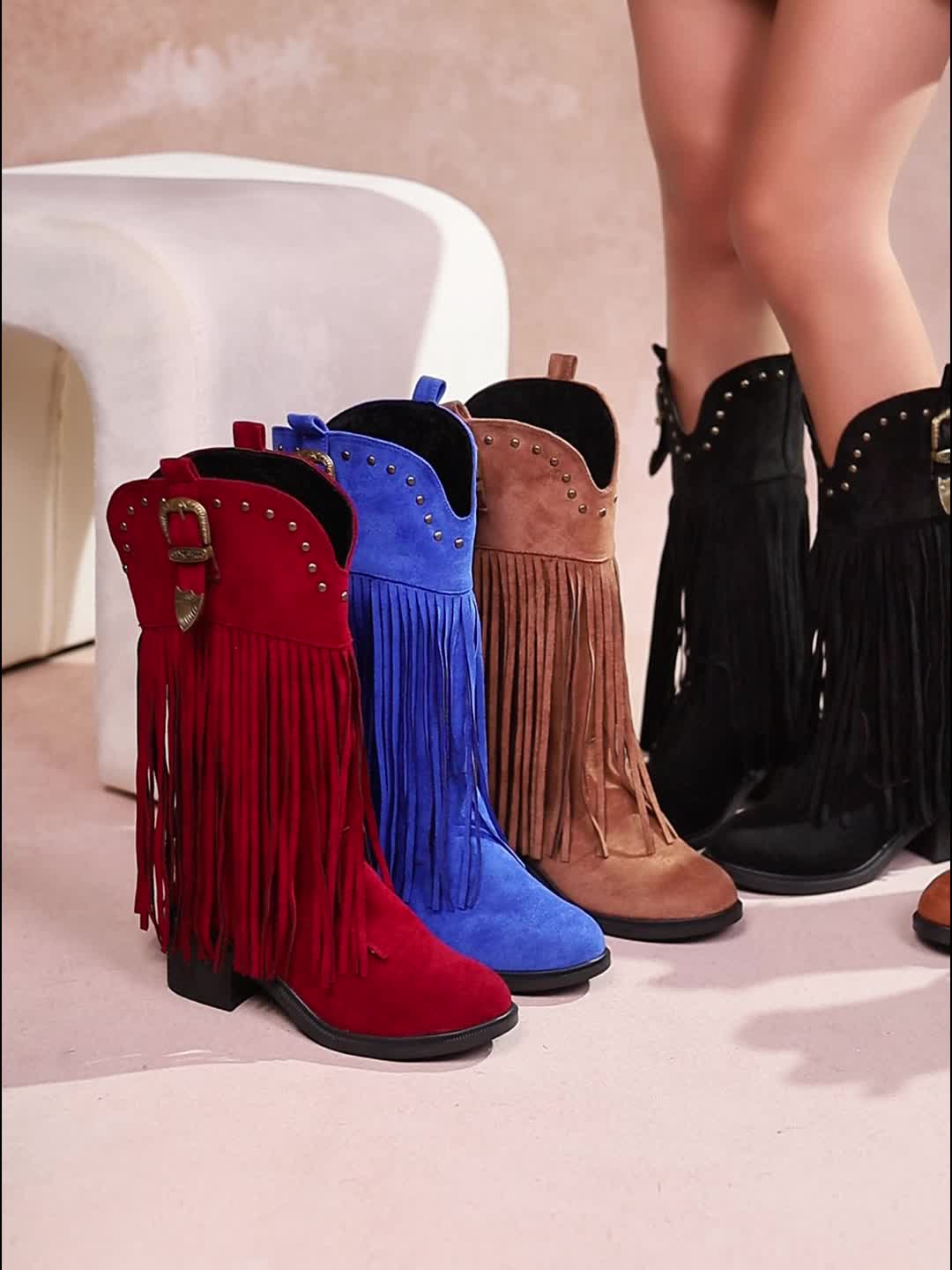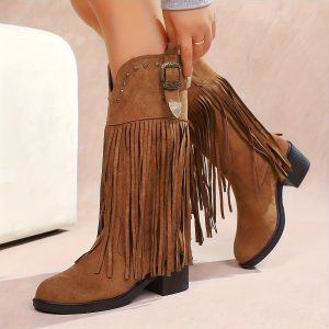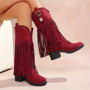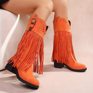 Women’S Slip-On Chunky Platform Boots – Slip-Resistant TPR Sole, All-Season Comfortable High Heels for Casual & Formal Outfits – Available in Red, Blue, Black, Brown, Orange – Everyday & Special Events, High Heel Boots, Versatile Footwear, Fringe Boot Design, Durable Footwear, Fashionconscious Women, Trendy Footwear, Soft Fabric Lining, Fashion Women