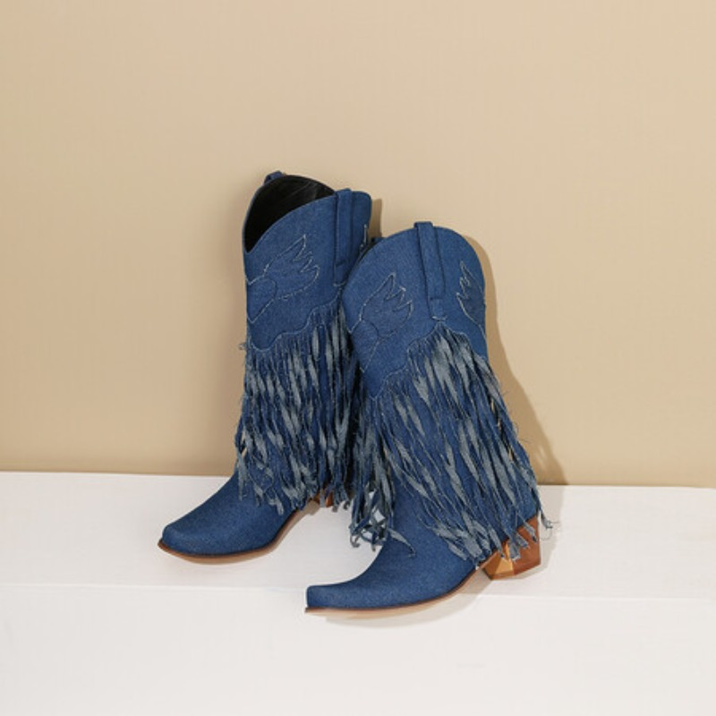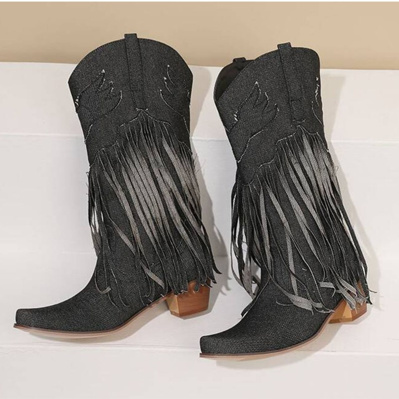 Women’s Western Cowboy Boots – Wide Calf Mid-Calf Pull-On Boots with Chunky block heel, Non-Slip Rubber outsole – Cowboy boots for Western dancing, country events, Everyday western style – Easy Slip-On Design, Cowboy Accessories, Western Dance Footwear, Denimlike Appearance, Durable Construction