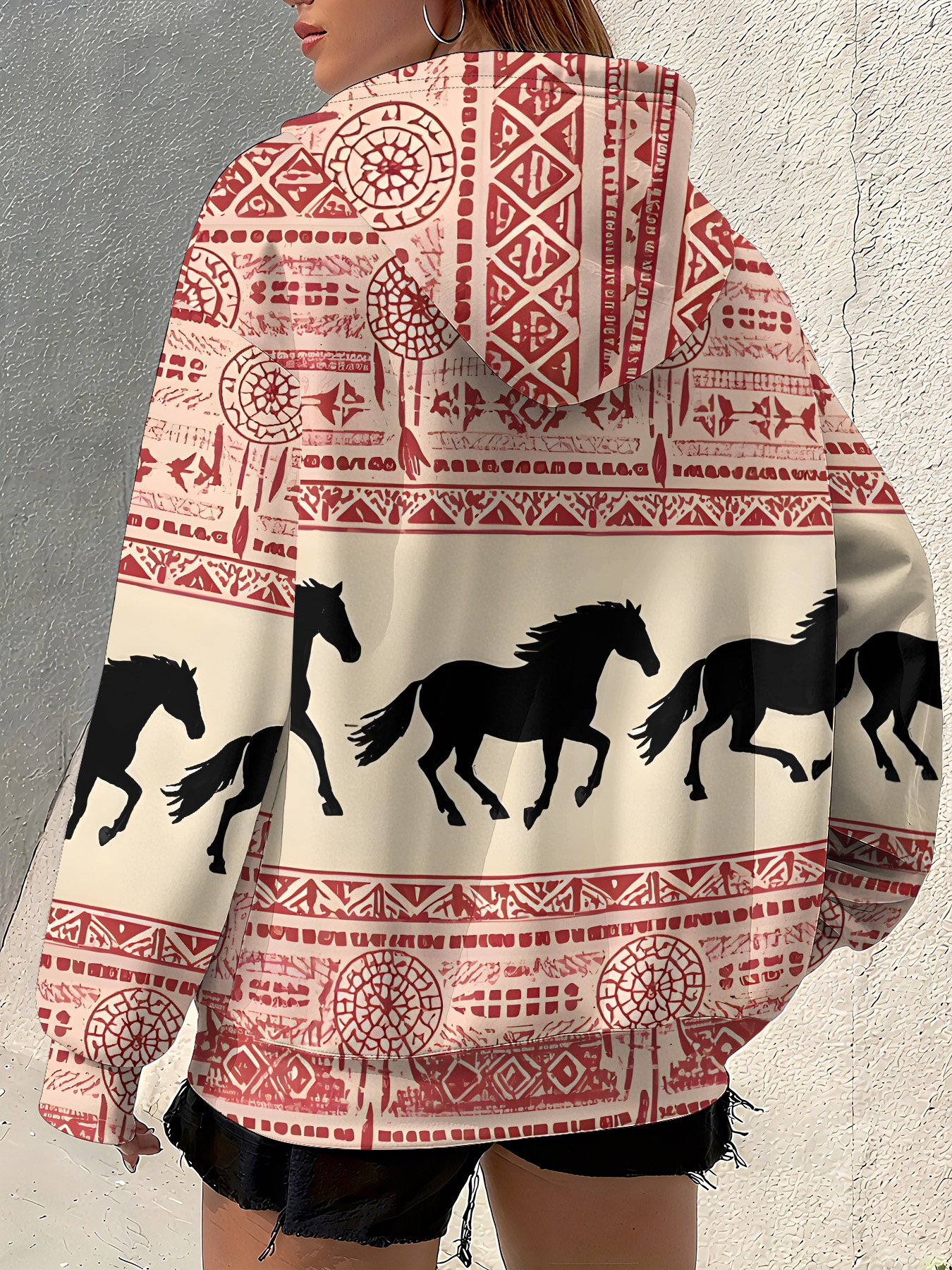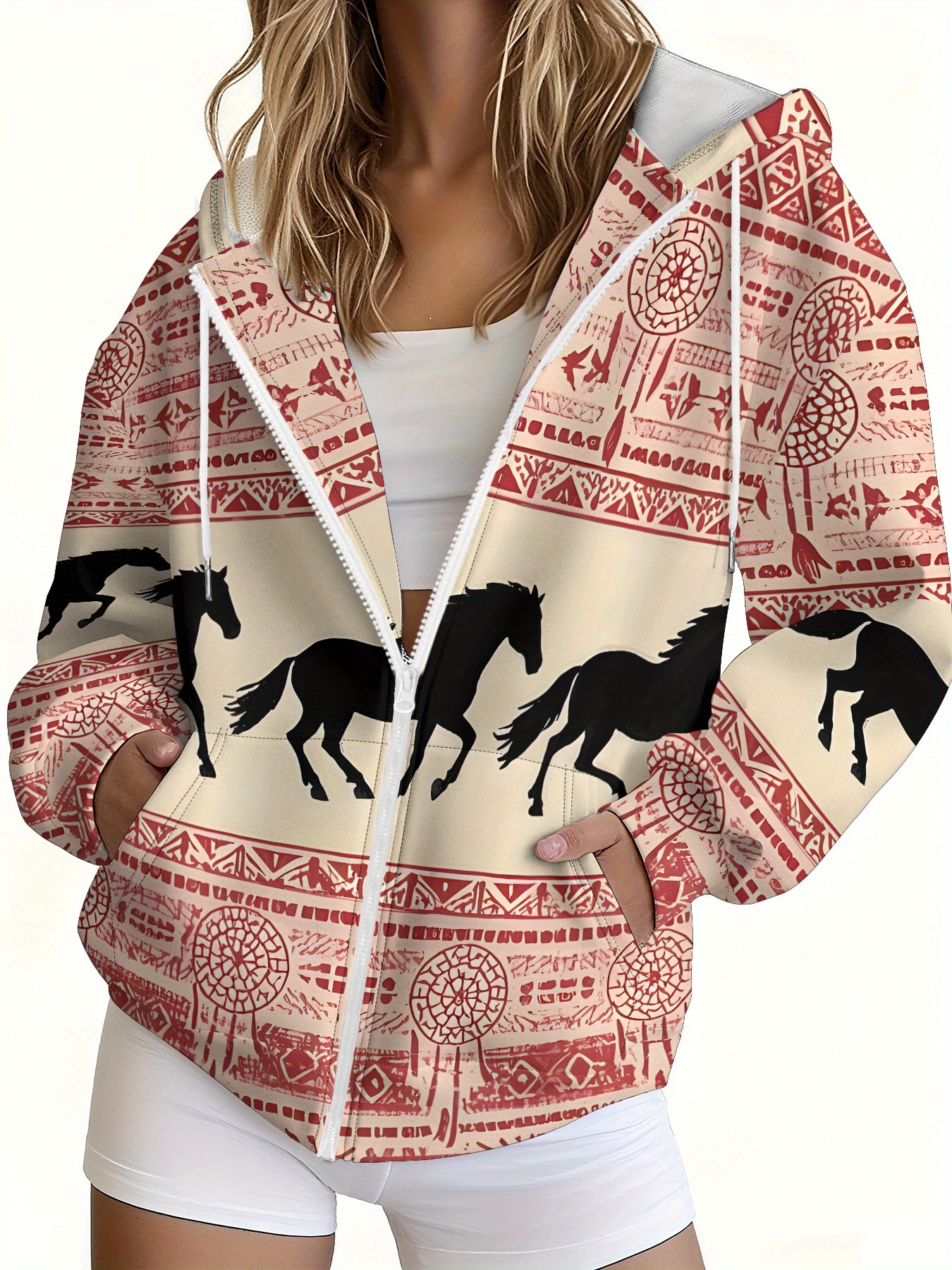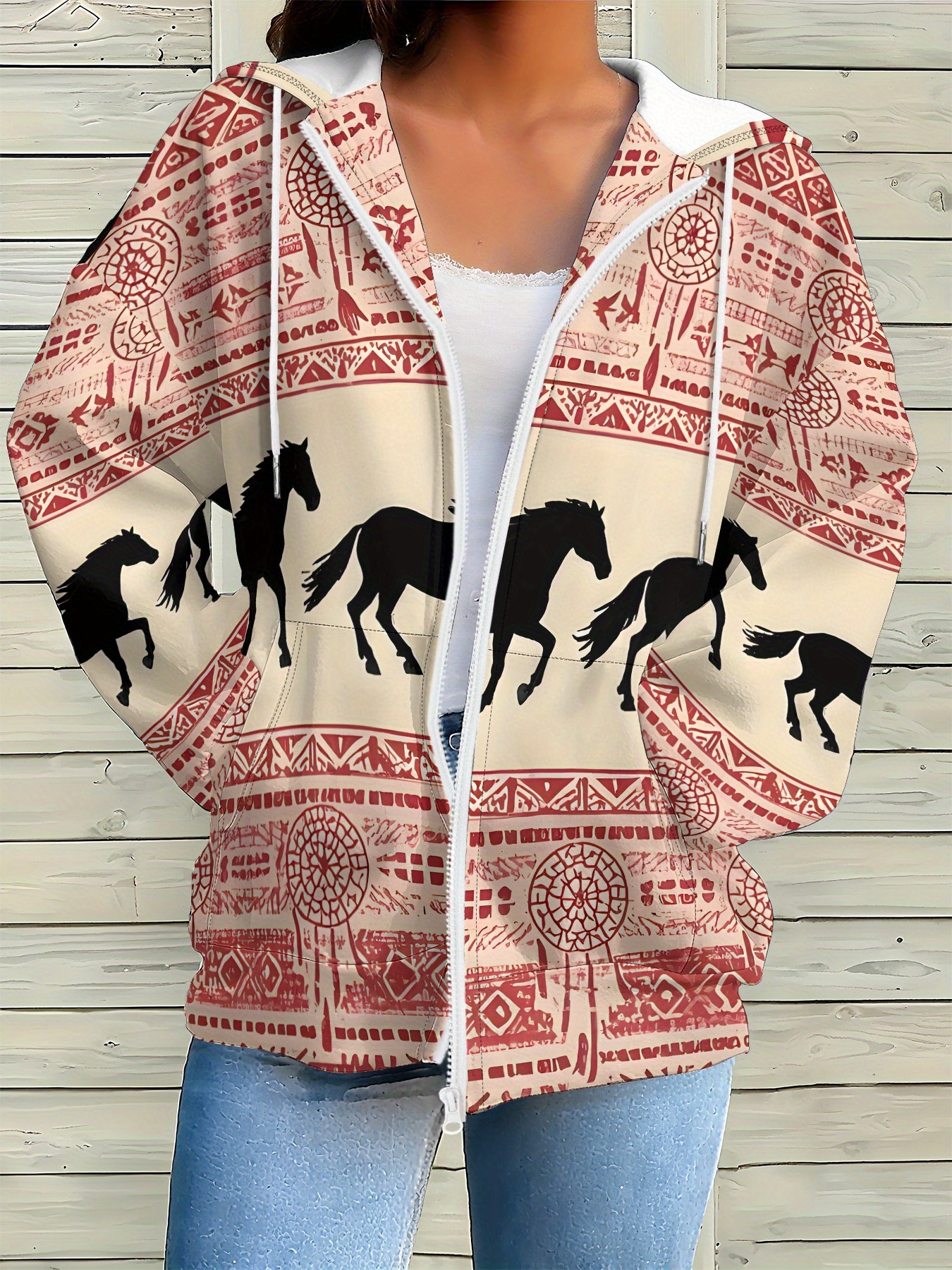 Women’s Western Horse Print Zip Hooded Jacket – Full-Zip Front Closure, Full-Body Horse & Southwestern Geometric Design (Horses, Cacti, Tribal Patterns), Machine Washable Winter Warmth, Casual Pullover with Pockets for Fall & Winter Outerwear – Brownu002FBeigeu002FRedu002FBlacku002FWhiteu002FGray – Cowboy-Themed Outerwear for Horse Lovers